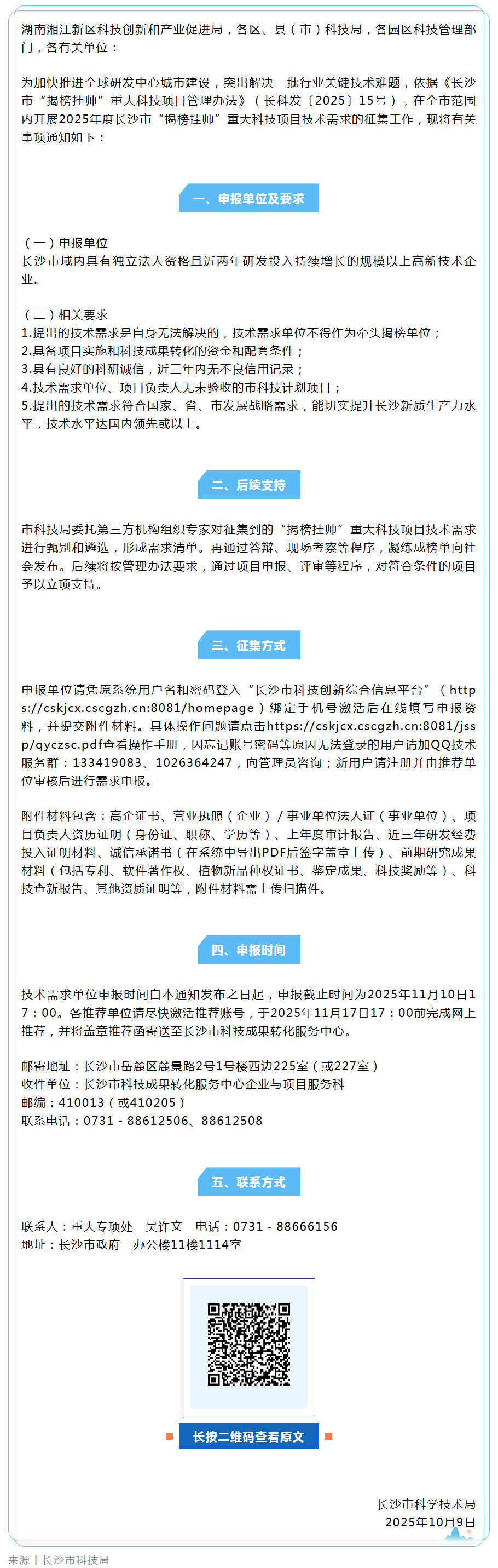 关于征集2025年度长沙市“揭榜挂帅”重大科技项目技术需求的通知