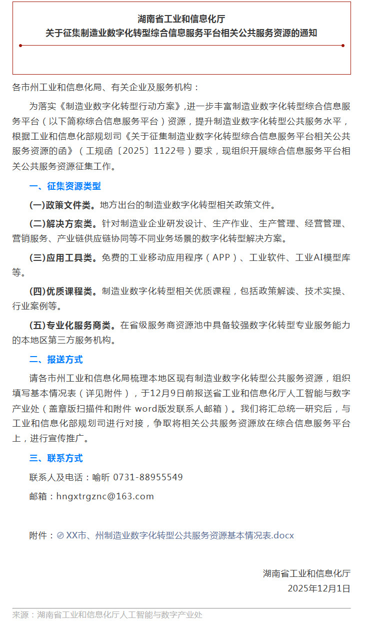 省工业和信息化厅组织开展制造业数字化转型综合信息服务平台相关公共服务资源征集工作|湖南省机械工业协会
