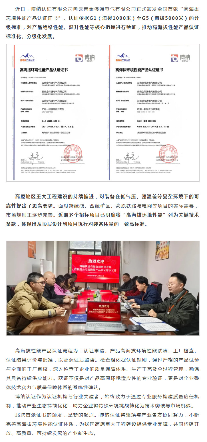 首张高海拔性能产品认证证书颁发