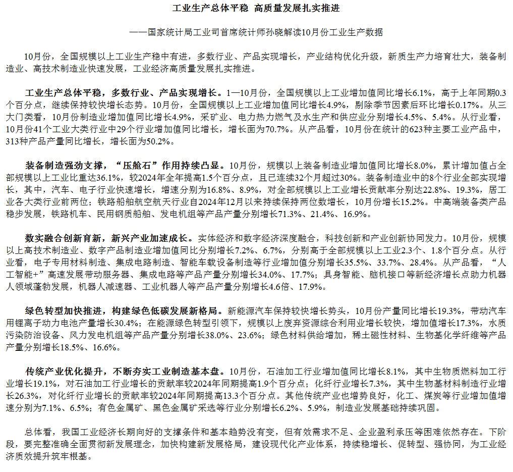 国家统计局工业司首席统计师孙晓解读10月份工业生产数据|湖南省机械工业协会