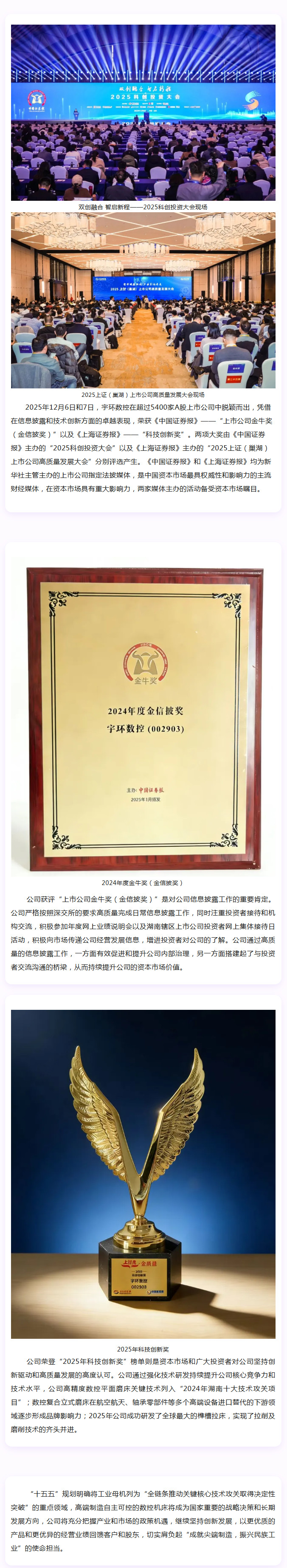 宇环数控信息披露和技术创新获高度认可,连续荣膺资本市场两项大奖