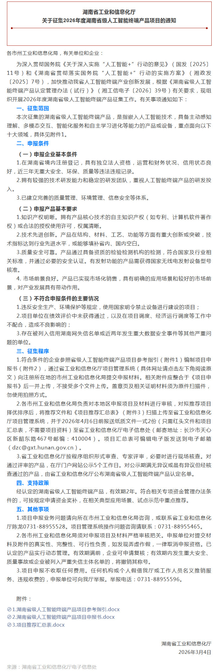 关于征集2026年度湖南省级人工智能终端产品项目的通知