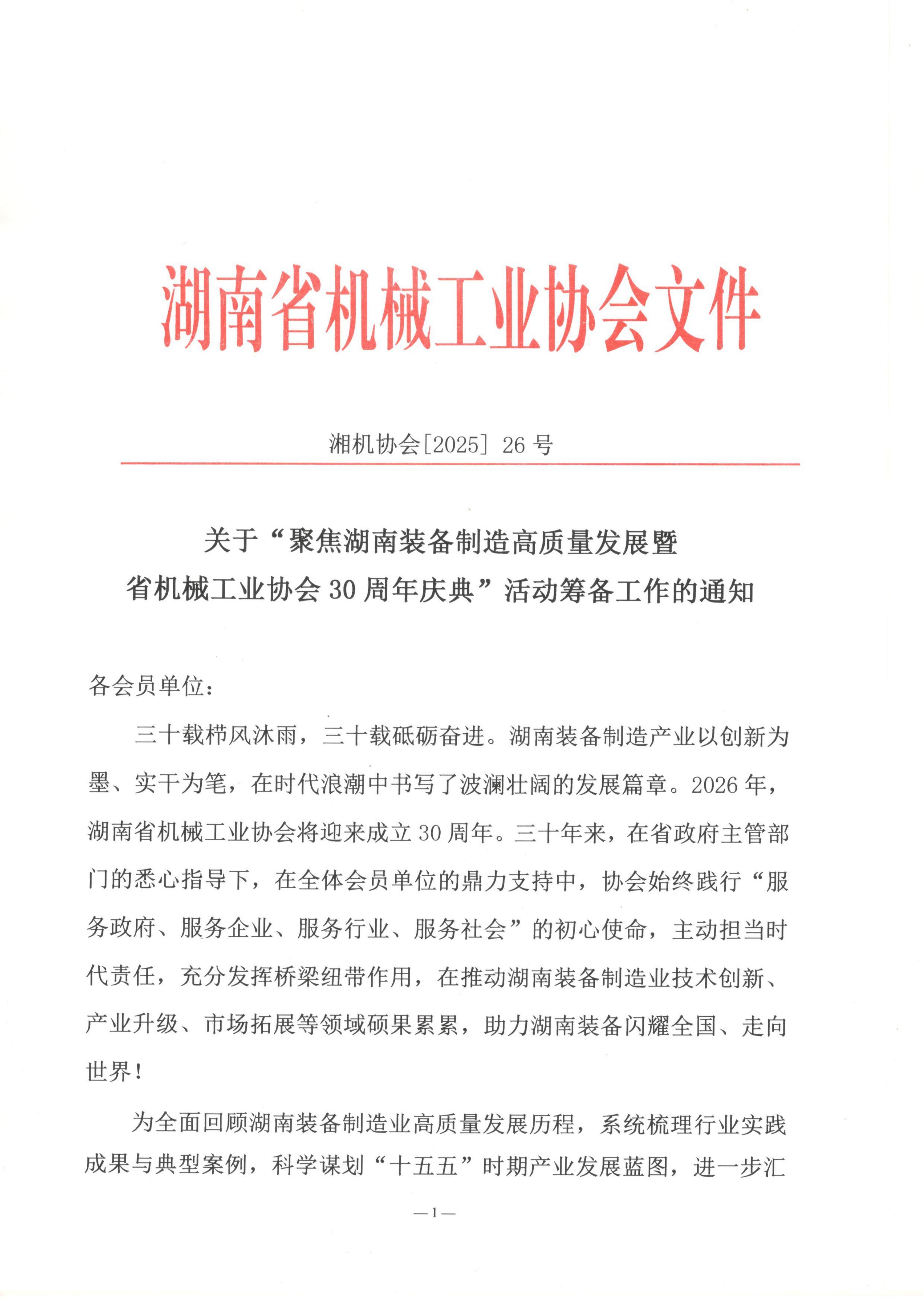 关于“聚焦湖南装备制造高质量发展暨省机械工业协会30周年庆典”活动筹备工作的通知|湖南省机械工业协会
