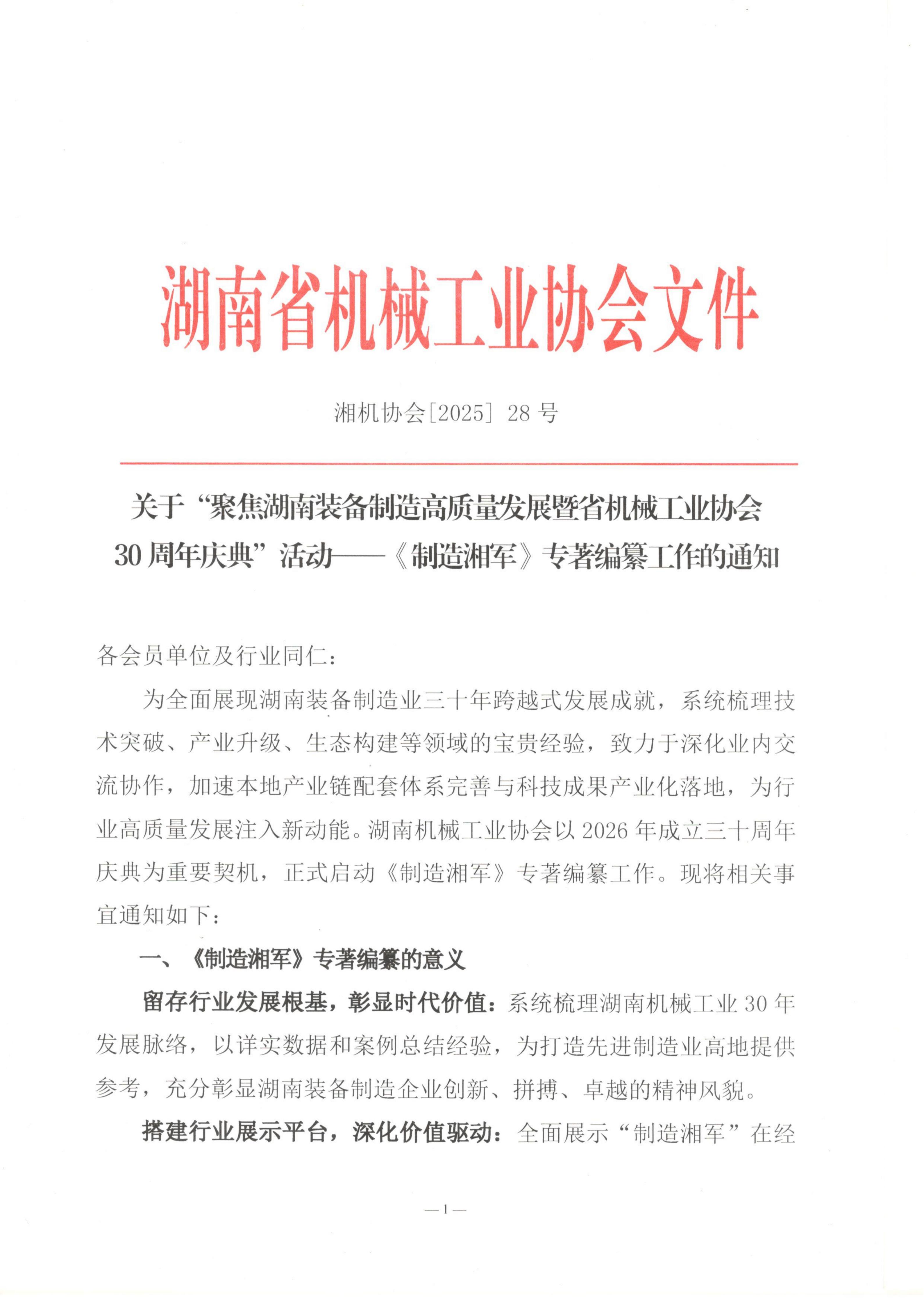 关于“聚焦湖南装备制造高质量发展暨省机械工业协会30周年庆典”活动——《制造湘军》专著编纂工作的通知|湖南省机械工业协会