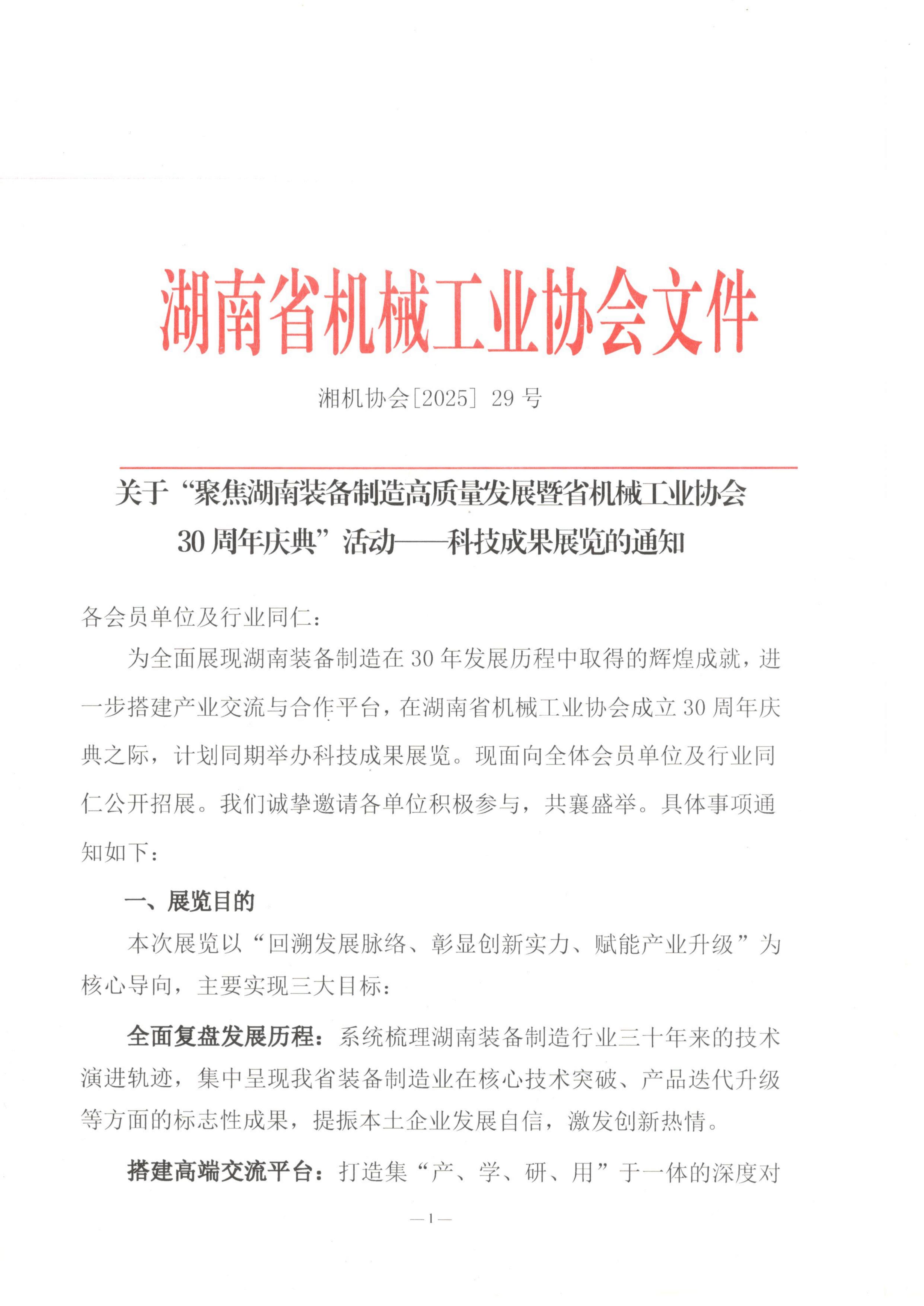 关于“聚焦湖南装备制造高质量发展暨省机械工业协会30周年庆典”活动——科技成果展览的通知,湖南省机械工业协会