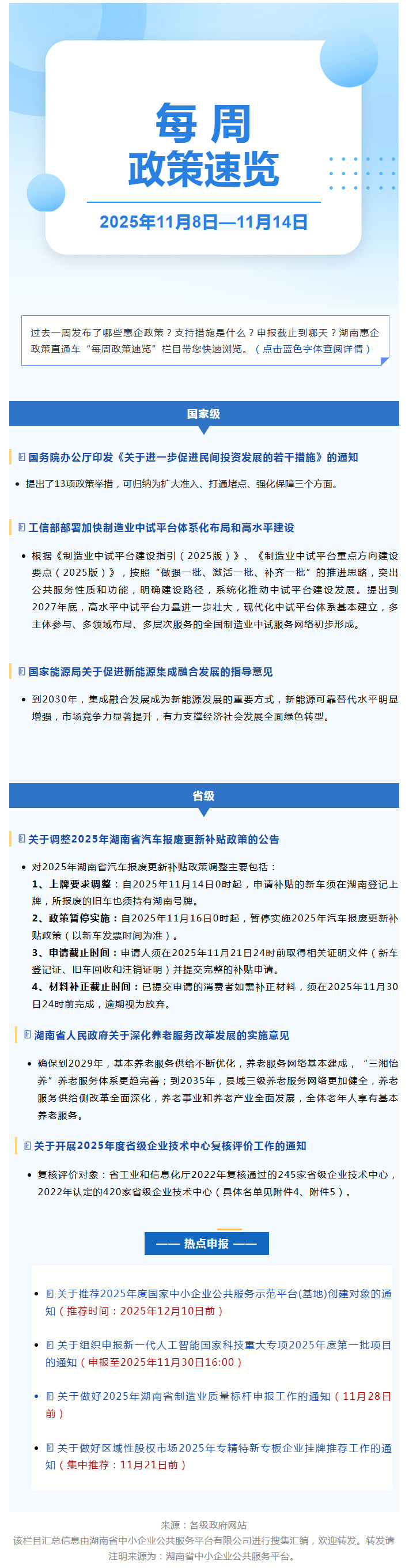 政策速览【2025年11月8日—11月14日】,湖南省机械工业协会