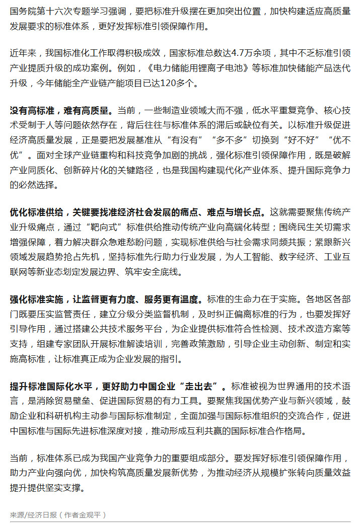 经济日报金观平:标准引领助产业强而优|湖南省机械工业协会