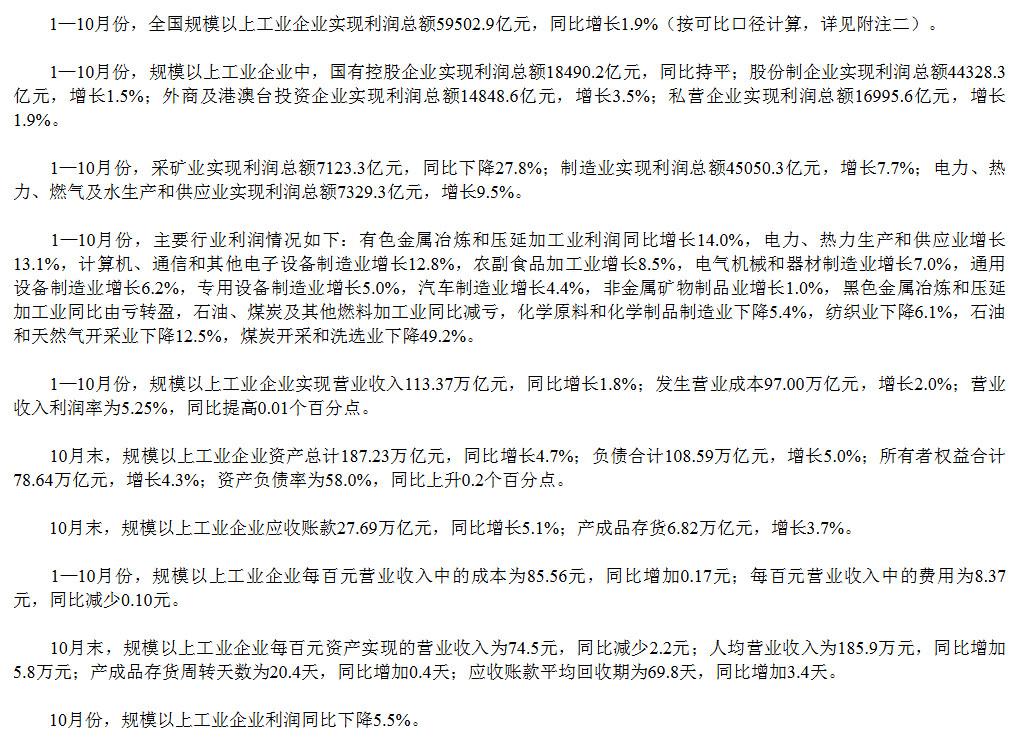 2025年1—10月份全国规模以上工业企业利润增长1.9%