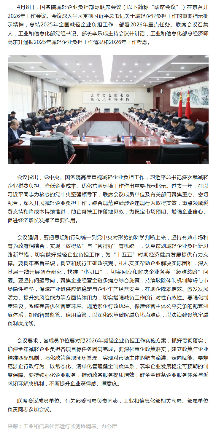 国务院减轻企业负担部际联席会议召开2026年工作会议